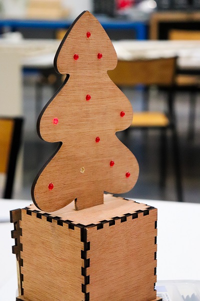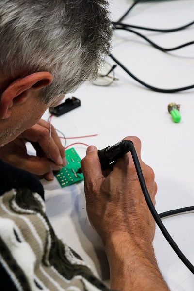 Atelier électronique spécial noël : les participants ont construit un petit sapin de noël brillant de mille feux !